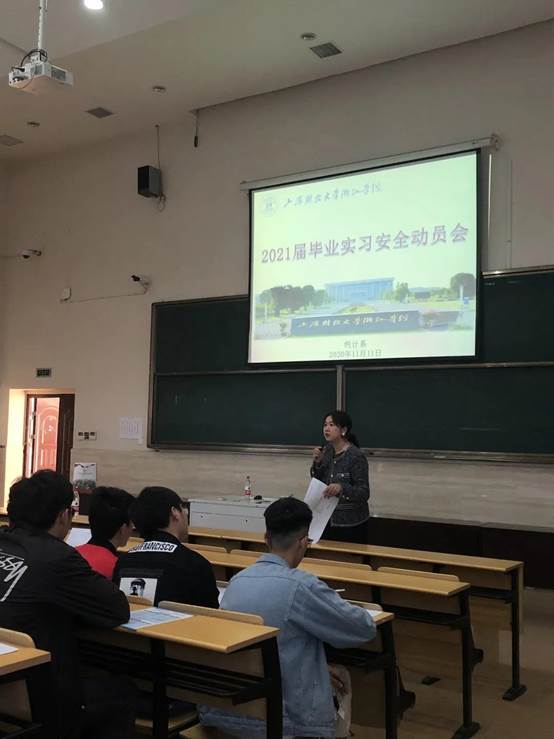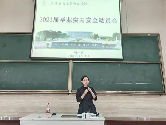 2020年11月11日下午4时,统计系在6幢102教室召开2021届毕业实习安全动员会。统计系主任王黎明教授,党总支副书记吴京京老师、教学秘书孙思宇老师, 17级辅导员李歆老师以及17级统计系全体毕业生参与此次会议。