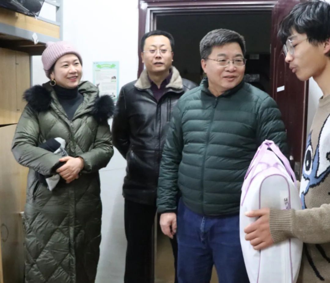 12月16日下午,统计系主任王黎明,副主任武斌,党总支副书记吴京京一行三人走访学生宿舍,为20级新生送去冬日温暖。