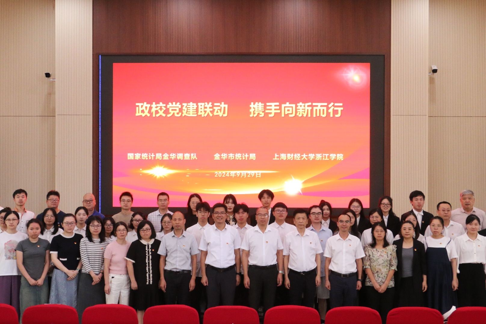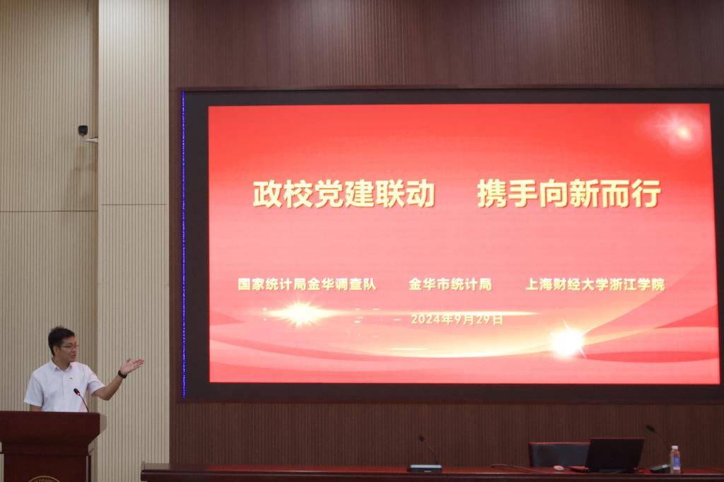 9月29日,学院统计系联合国家统计局金华调查队、金华市统计局,在学院120报告厅开展了“政校党建联动 携手向新而行”主题党日活动。此次活动不仅是一次党建联建的重要实践,也是对前期政校党建联建成果的精彩展示和深化拓展,更是学院积极推进“一融双高”建设与统计系践行“双学双融”发展理念的生动实践。活动中,还举行了新生“开学第一课”系列活动启动仪式。市调查队党组成员、副队长张国民、楼涛及纪检组长徐玉飞,市统计局党组成员、社会经济调查队队长赵奇峰,上海财经大学教务处副处长吴纯杰,以及学院党委副书记何志强、学院党委委员、组织部部长张正亮等出席活动。此外,来自市调查队和市统计局的党员、干部代表,以及新利在线登录全体新生和师生党员等共计200余人也参与了此次主题党日活动。