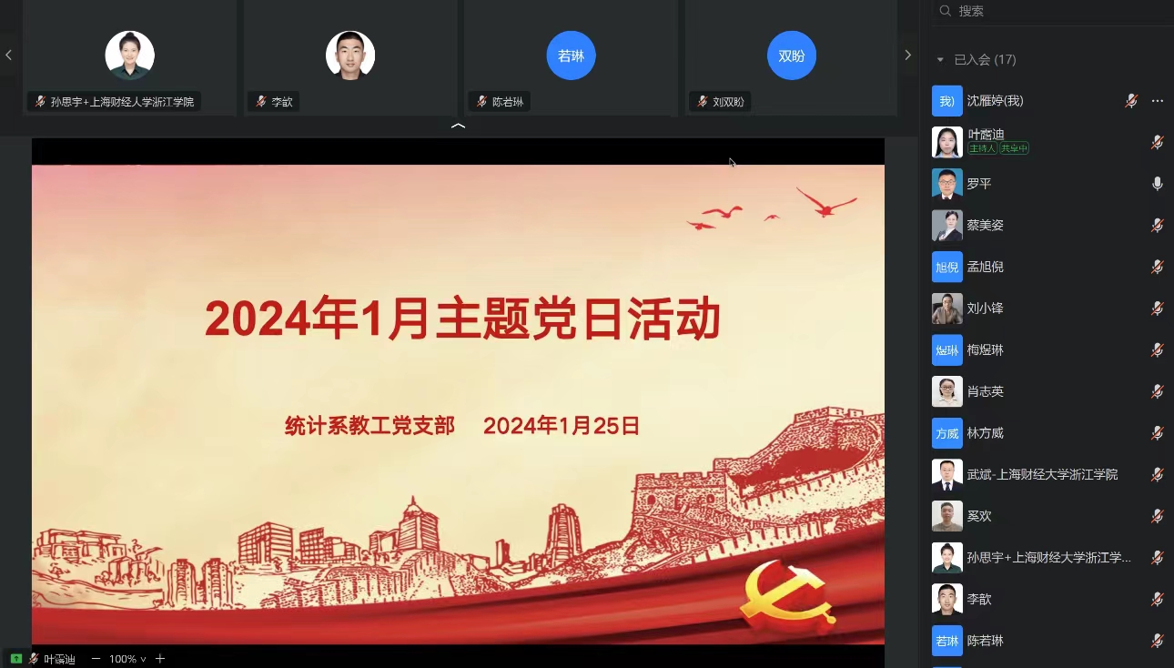 为深入学习贯彻习近平总书记重要讲话精神和重要指示批示精神,进一步增强党员教师的责任感和使命感,强化党性修养、坚定初心使命、树牢责任担当,继续传承和发扬党的优良传统和作风。1月25号上午,统计系教工党支部以“实干先行抓机遇,凝聚共识谱新篇”为主题,开展1月主题党日活动。